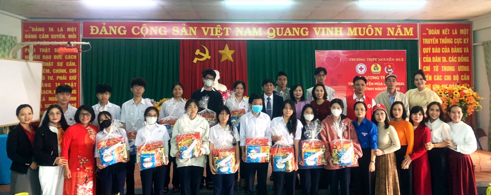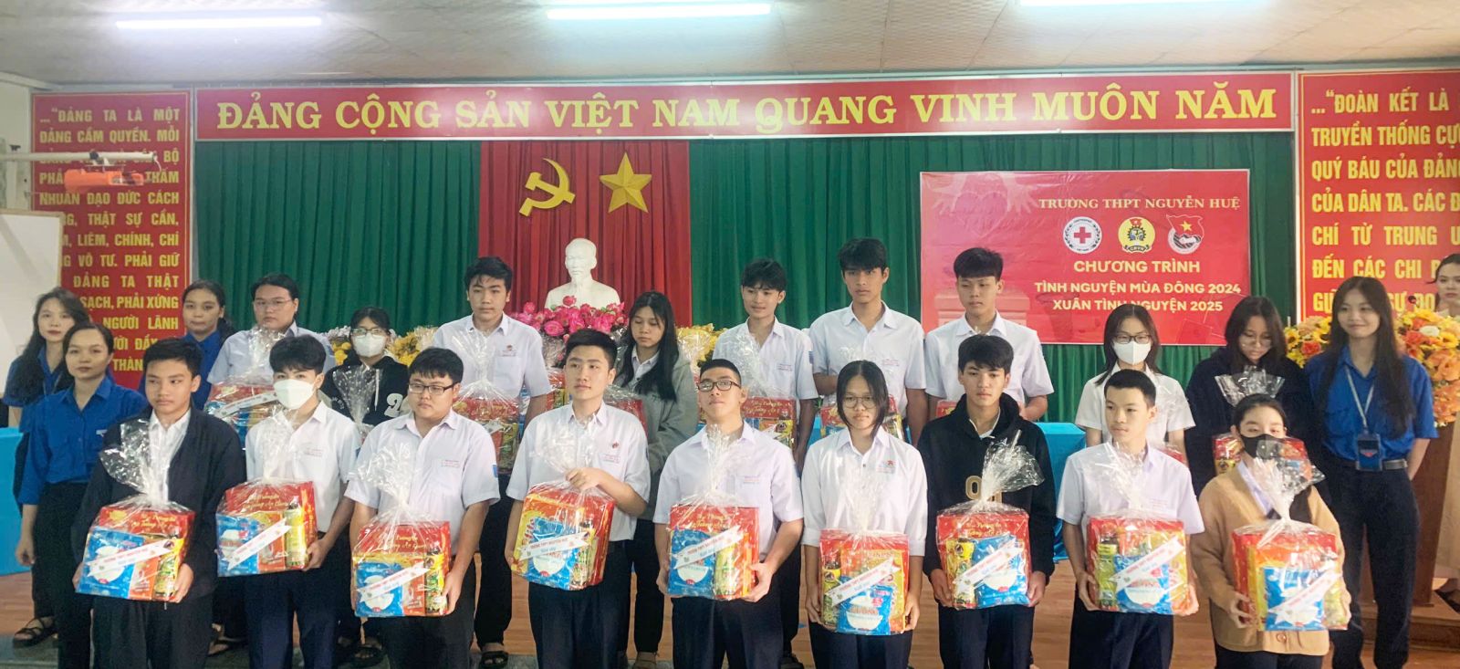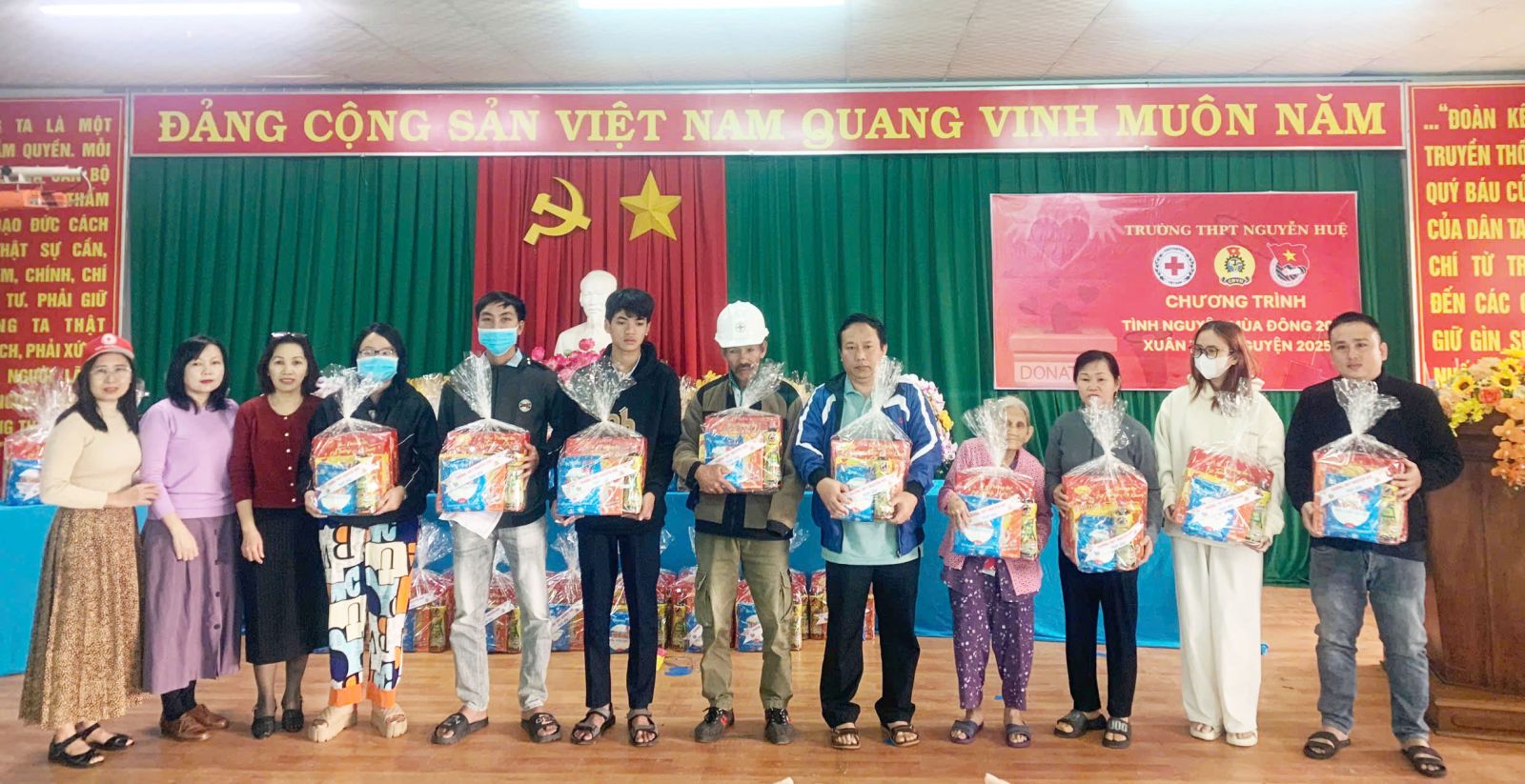 Nhân dịp đón Tết Nguyên đán Ất Tỵ 2025,với tinh thần tương thân tương ái, đoàn kết, yêu thương. Sáng ngày 18/01/2025, Hội chữ thập đỏ trường THPT Nguyễn Huệ phối hợp với Ban Giám hiệu, Đoàn thanh Niên, Ban đại diện CMHS nhà trường và Công Đoàn trường THPT Nguyễn Huệ đã trao quà và gửi lời chúc tết đến các hộ gia đình có hoàn cảnh khó khăn trên địa bàn Phường 1, 2, 4, 5, 9 các em học sinh có hoàn cảnh khó khăn đang học tập tại trường.