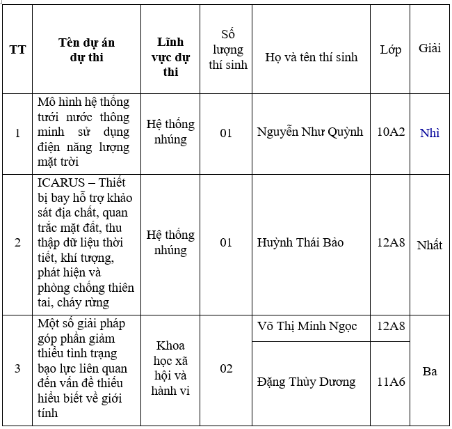 Cuộc thi đã thu hút rất nhiều sản phẩm có chất lượng cao, trong đó trường THPT Nguyễn Huệ tham gia với 3 dự án và đạt kết quả như sau: