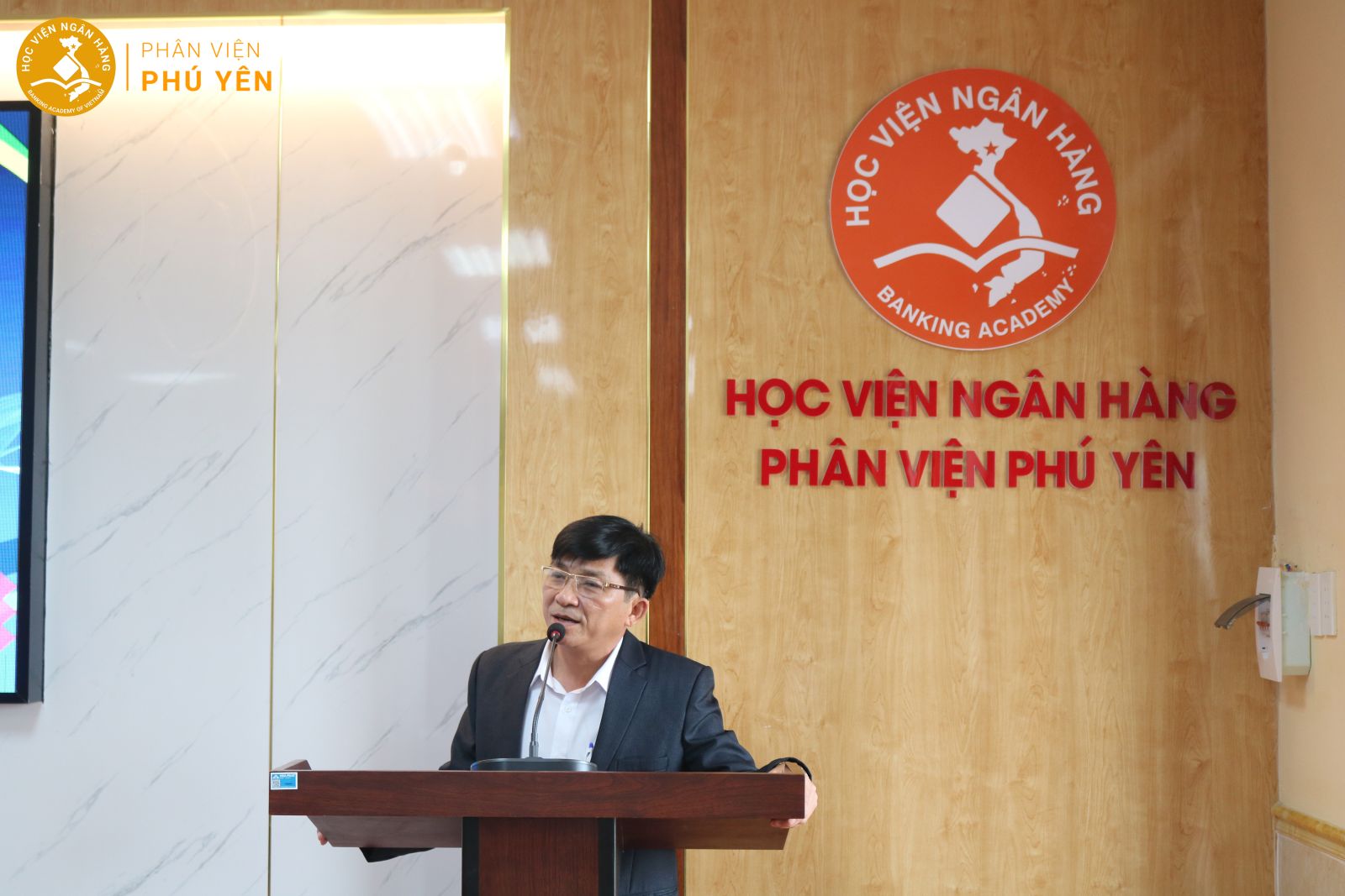 Tại buổi lễ, TS. Trần Thanh Long – Phó Bí thư Phụ trách Đảng ủy, Giám đốc Học viện Ngân hàng – Phân viện Phú Yên, đã giới thiệu tổng quan về Phân viện, nhấn mạnh vai trò là cơ sở đào tạo phía Nam của Học viện Ngân hàng. Ông khẳng định Phân viện luôn cam kết mang đến chất lượng giảng dạy đồng bộ, giúp sinh viên được học tập và nghiên cứu trong môi trường chuẩn mực, hiện đại. Bên cạnh sứ mệnh đào tạo, Phân viện còn tiên phong trong các hoạt động phục vụ cộng đồng. Sinh viên Viện Đào tạo Quốc tế (ISBA) – Học viện Ngân hàng đã triển khai nhiều chương trình ý nghĩa tại Phân viện Phú Yên, không chỉ góp phần lan tỏa tri thức mà còn tạo cơ hội để các bạn trẻ rèn luyện kỹ năng thực tế. Ông bày tỏ mong muốn học sinh trường THPT Nguyễn Huệ có thể tham gia các hoạt động cùng sinh viên ISBA, qua đó trải nghiệm không khí học tập năng động của một sinh viên đại học, giúp các em có sự chuẩn bị vững chắc hơn cho hành trình phía trước.