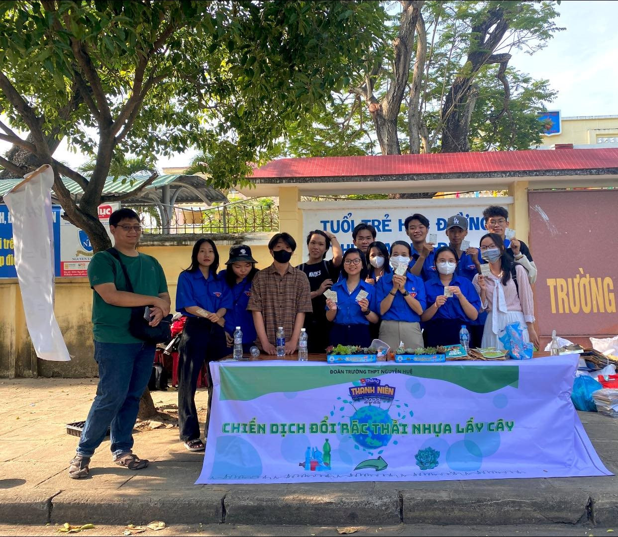 Bên cạnh đó Đoàn Thanh niên trường THPT Nguyễn Huệ cũng tổ chức nhiều hoạt động như: Phân loại, thu gom rác thải tái chế (chai, ly nhựa, giấy loại, …); gom rác tái chế đổi quà tặng đã trở thành hoạt động quen thuộc của học sinh trường THPT Nguyễn Huệ. Ngoài ra nhà trường chuẩn bị đặt tại mỗi lớp học 02 thùng rác (01 thùng là rác tái chế, 01 thùng là rác thải sinh hoạt), trong sân trường có đặt 04 xe phân loại rác tái chế gồm 02 ngăn (01 ngăn chứa rác thải nhựa, 01 ngăn chứa giấy loại) Cuối tuần Đội xung kích tình nguyện của Đoàn trường tiến hành thu gom, phân loại để bán lấy kinh phí hổ trợ cho học sinh khó khăn; Vẽ tranh bích họa về tác hại của ô nhiễm môi trường ở các khu vực trong và ngoài cổng trường; Tổ chức ra quân dọn vệ sinh, rác thải ở bờ biển Tuy Hòa, Công viên Hồ điều hòa, gầm cầu Hùng Vương và dọc Bờ sông ba,…).