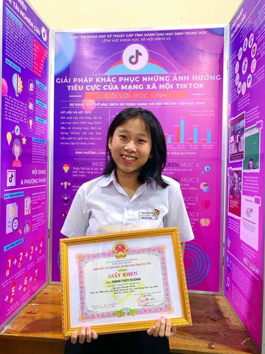 – Giải khuyến khích: Dự án “Giải pháp khắc phục những ảnh hưởng tiêu cực của mạng xã hội TikTok đối với học sinh”, lĩnh vực Khoa học xã hội và hành vi của em Đặng Thuỳ Dương, lớp 12A6.