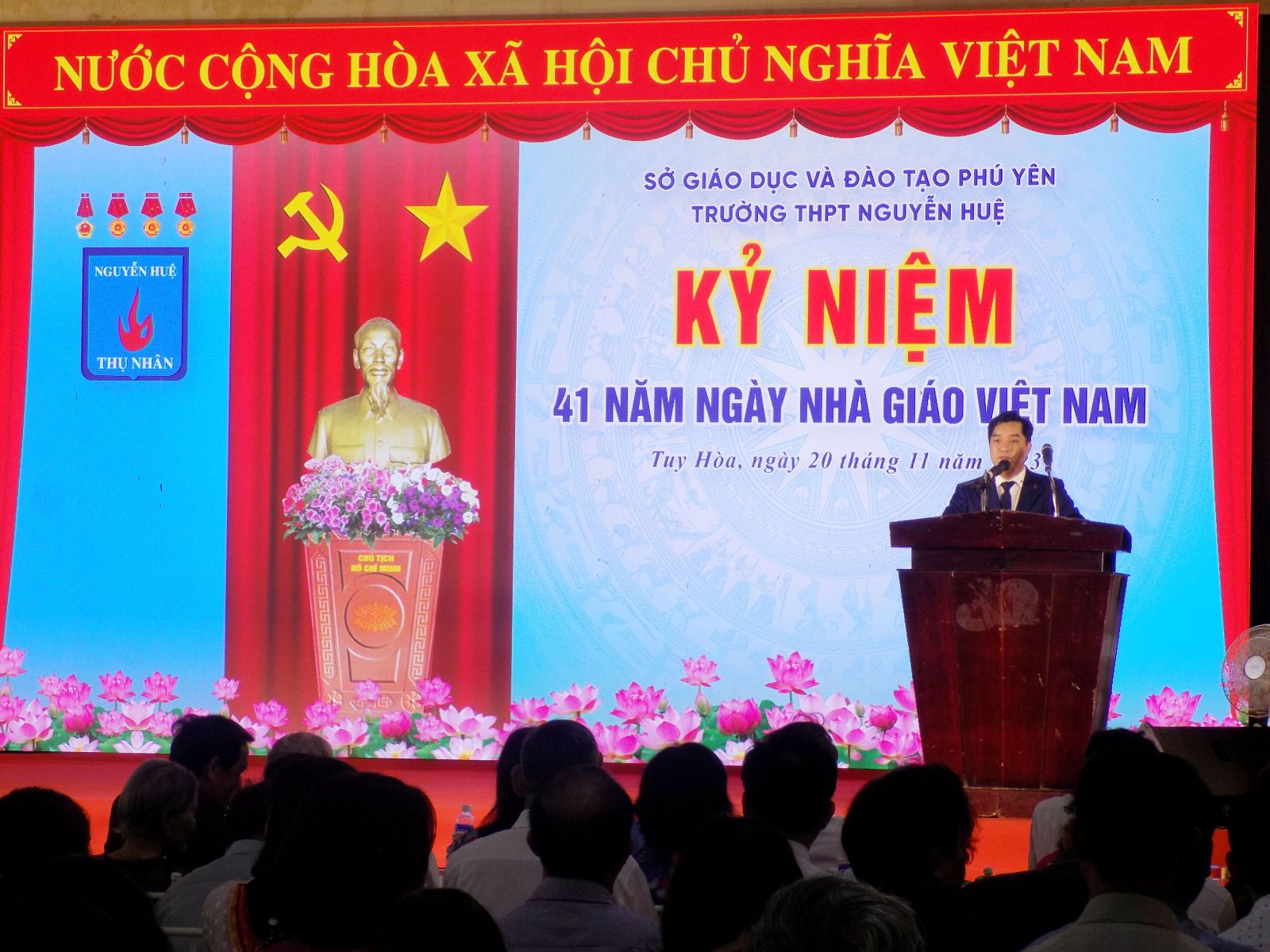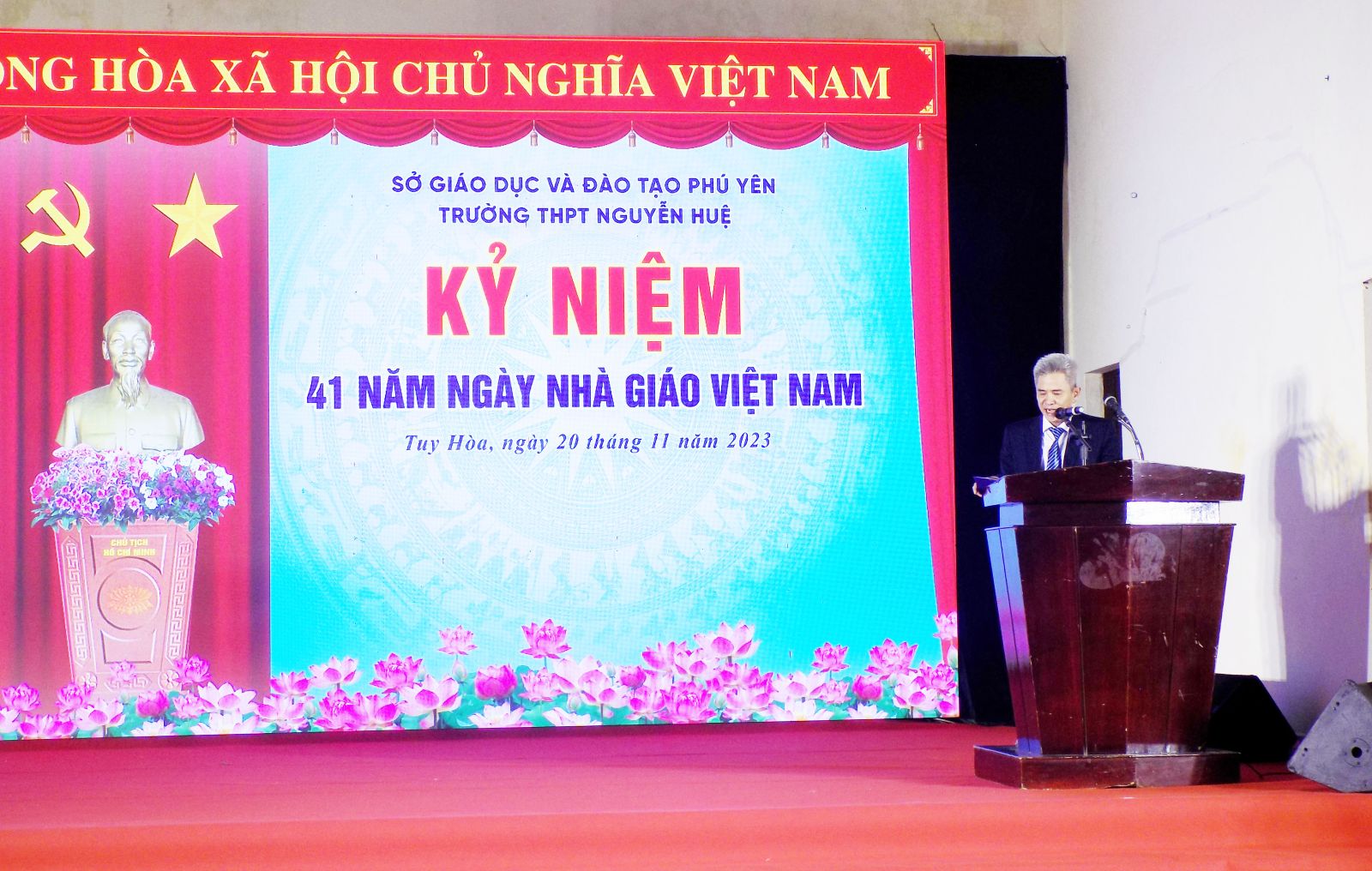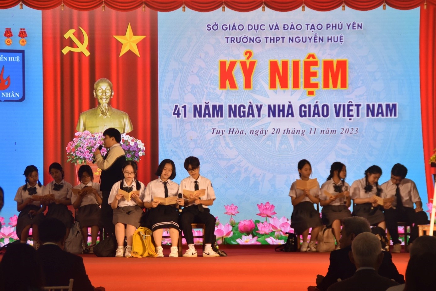 Tại chương trình, thầy Lê Văn Son – bí thư Đảng bộ, hiệu trưởng Nhà trường đã ôn lại truyền thống 41 năm ngày Nhà giáo Việt Nam 20/11. Đây là dịp để các thế hệ nhà giáo và học sinh nhà trường có cơ hội được gặp gỡ, giao lưu và kết nối; đồng thời thể hiện sự tri ân, biểu dương đối với các cá nhân, tập thể đã đạt nhiều thành tích xuất sắc trong quá trình dạy và học, nhằm tiếp thêm ngọn lửa yêu thương, thắp sáng truyền thống dạy tốt – học tốt dưới mái Trường THPT Nguyễn Huệ.