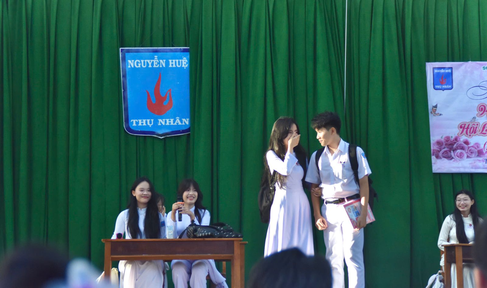 Thầy Lê Văn Son – Bí thư Đảng ủy, Hiệu trưởng nhà trường tặng hoa cho cô Tăng Huỳnh Thanh Trang chủ tịch Công Đoàn trường đại diện cho nữ CBGV-NV và em Nguyễn Lê Nhi Quỳnh đại diện cho nữ sinh trường THPT Nguyễn Huệ.