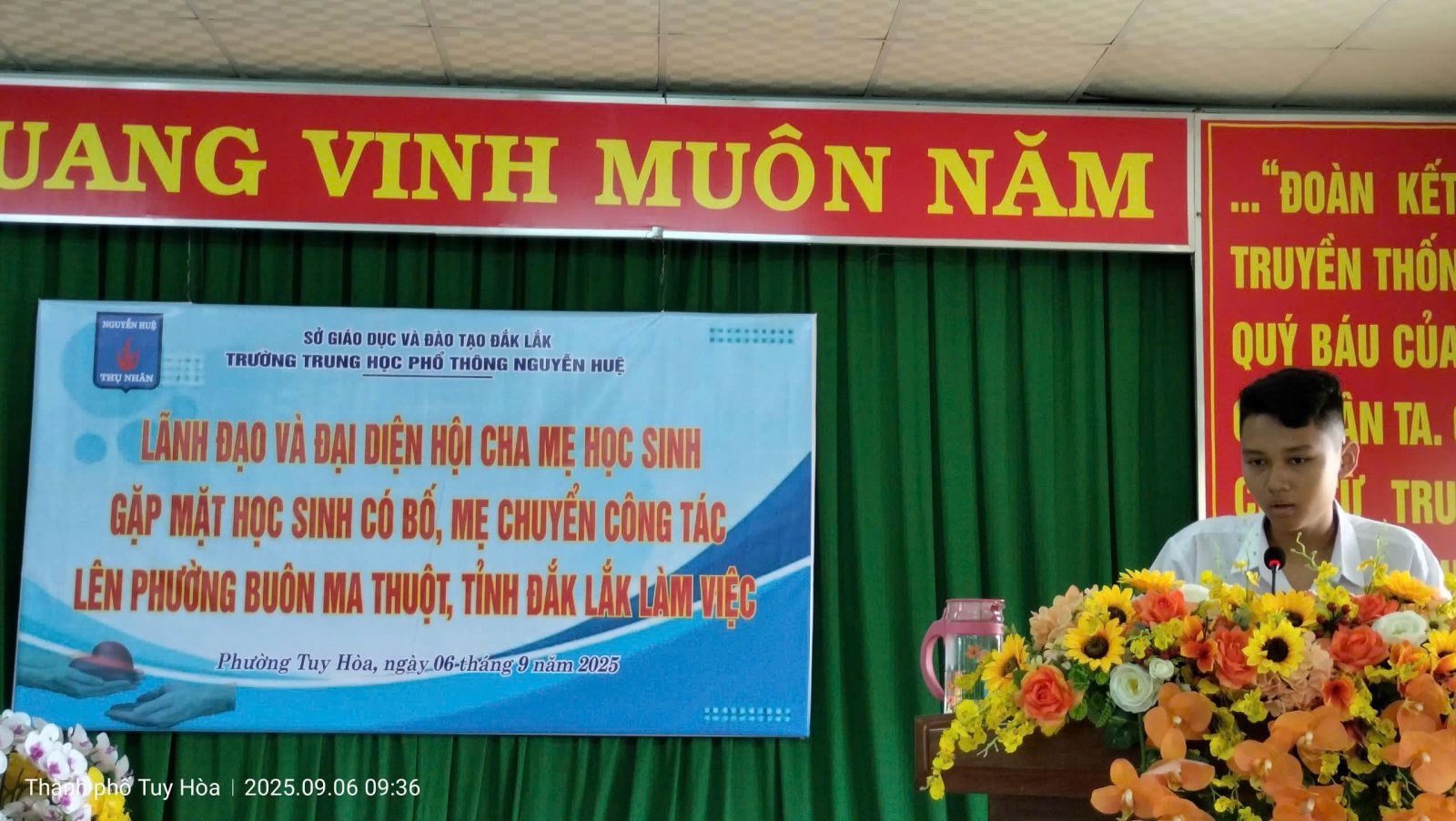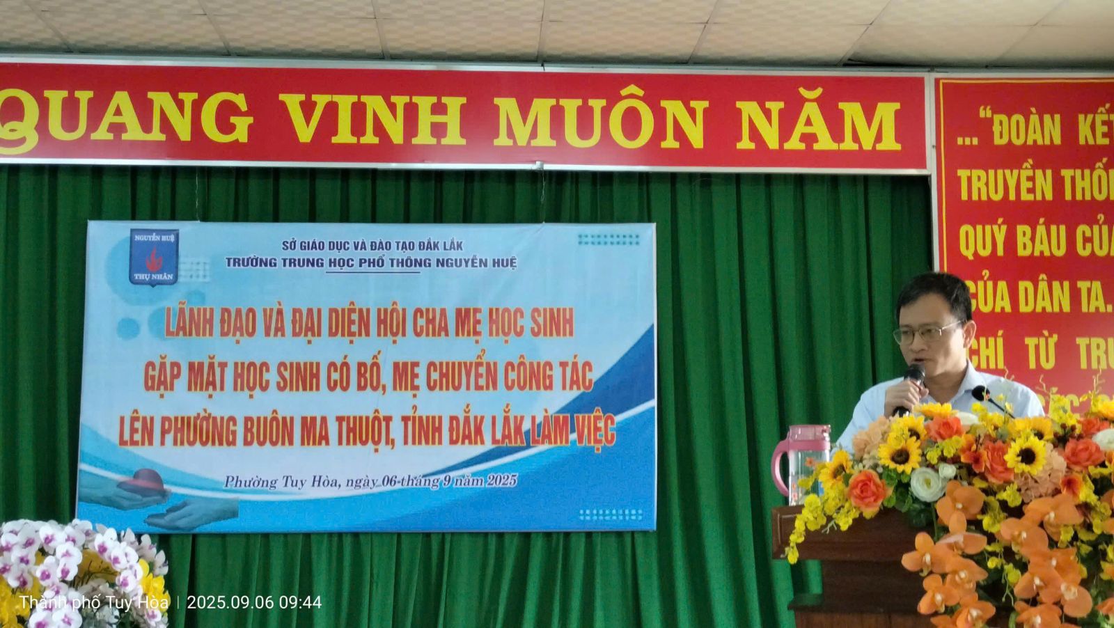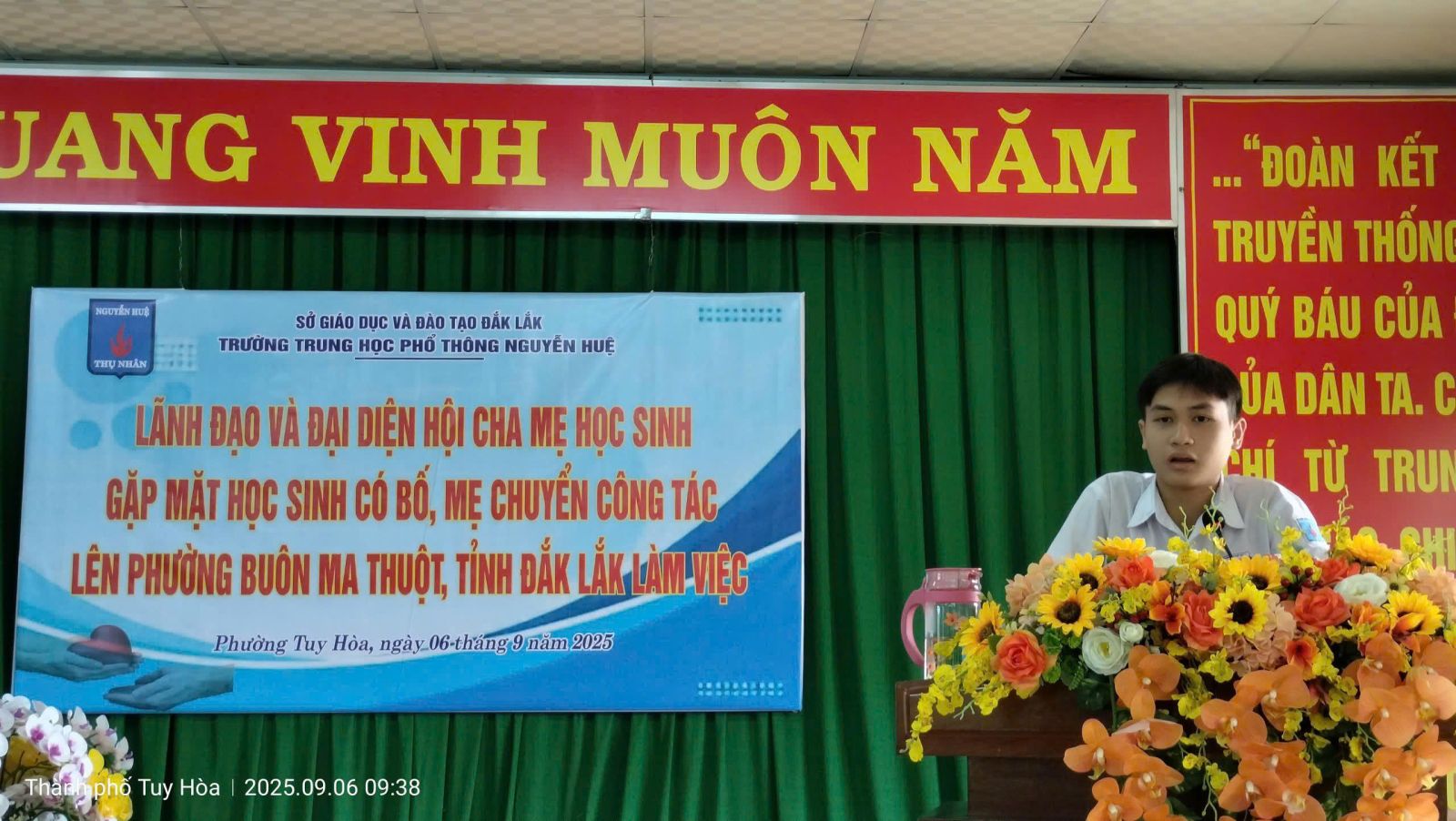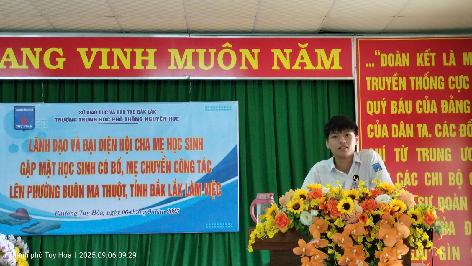 Sáng này 6/9/2025, lãnh đạo và đại diện hội cha mẹ học sinh trường THPT Nguyễn Huệ đã có buổi gặp mặt thân tình với những học sinh có bố, mẹ chuyển công tác lên phường Buôn Ma Thuột – Đắk Lắk làm việc sau thời gian thực hiện sáp nhập tỉnh.