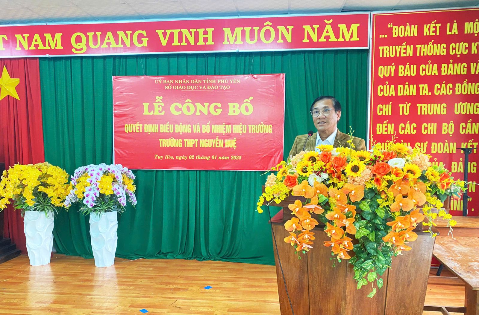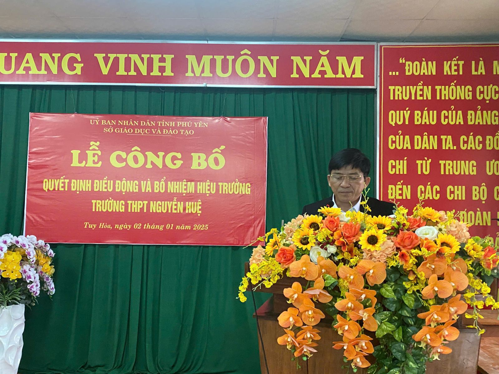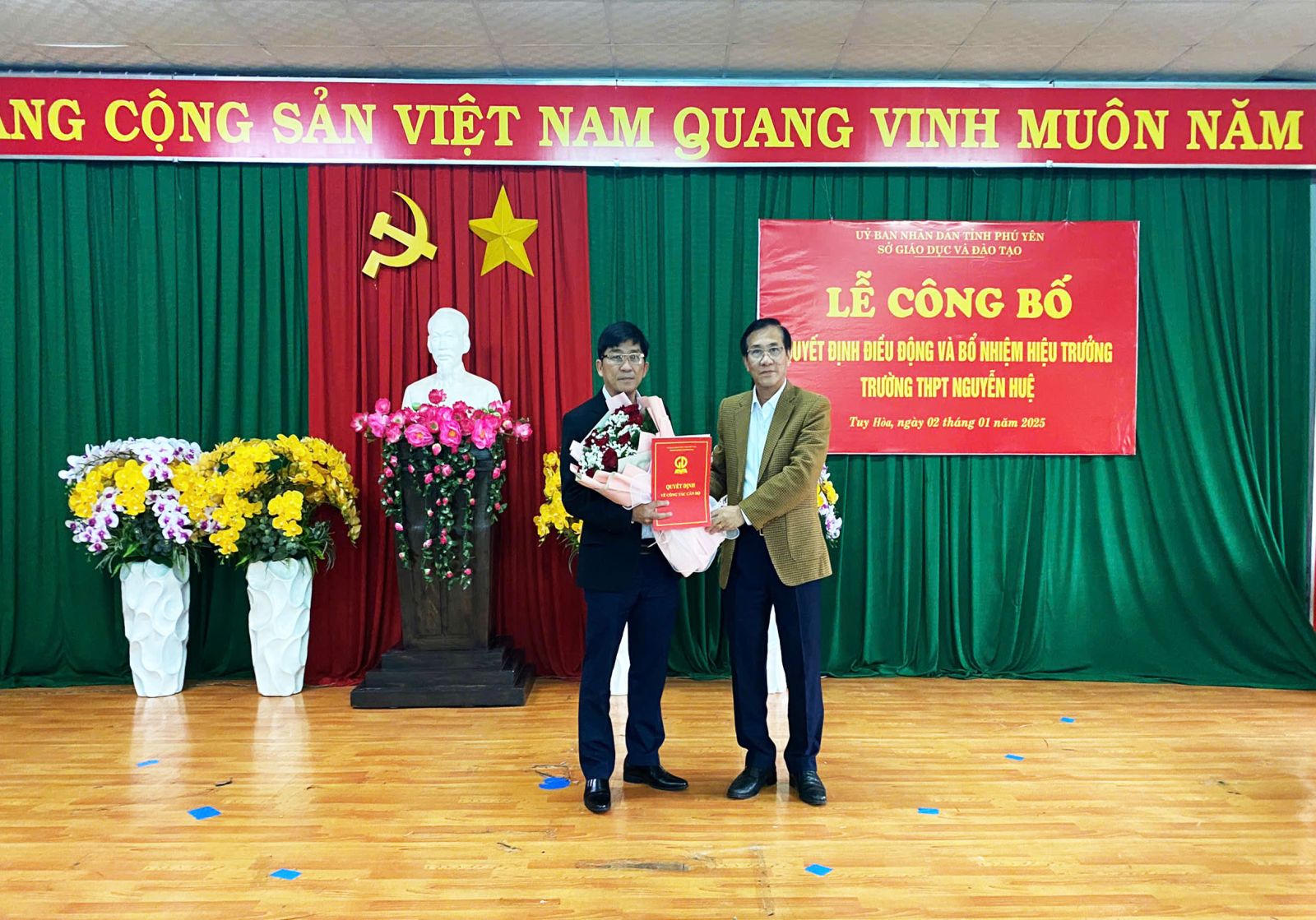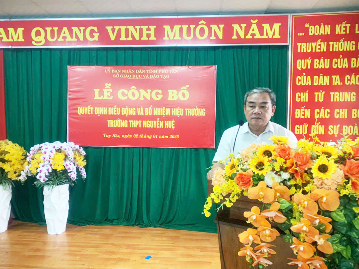 Tại buổi lễ, ông Huỳnh Quốc Lực – Trưởng phòng Tổ chức cán bộ Sở Giáo dục và Đào tạo Phú Yên đã công bố các Quyết định, thầy Trần Khắc Lễ – Giám đốc Sở Giáo dục và Đào tạo đã trao quyết định điều động đồng chí Lê Thành Phương – Hiệu trưởng Trường THPT Nguyễn Trường Tộ đến nhận công tác và giữ chức vụ Hiệu trưởng Trường THPT Nguyễn Huệ.