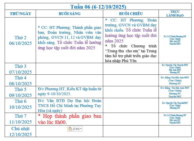Lịch công tác tuần 06 năm học 2025 - 2026, áp dụng từ ngày 06/10/2025 đến 12/10/2025