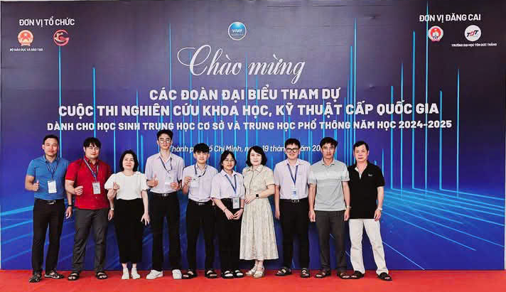 | Học sinh và thầy cô của đoàn Phú Yên chụp ảnh lưu niệm sau khi nhận giải Cuộc thi Khoa học kỹ thuật cấp quốc gia học sinh THCS và THPT năm học 2024-2025. Ảnh: CTV |