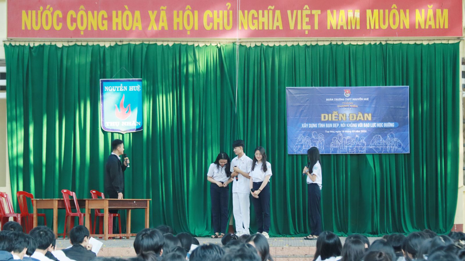 Nhằm giáo dục ý thức đạo đức, lối sống văn hóa, ngăn chặn nạn bạo lực học đường, định hướng xây dựng tình bạn đẹp cho học sinh THPT. Sáng ngày 18/03/2024, Đoàn trường THPT Nguyễn Huệ đã tổ chức Diễn đàn “Xây dựng tình bạn đẹp – nói không với bạo lực học đường” năm học 2023 – 2024.