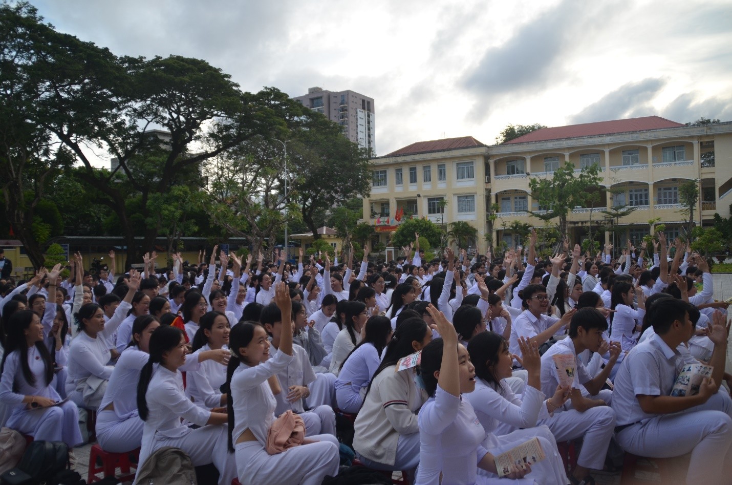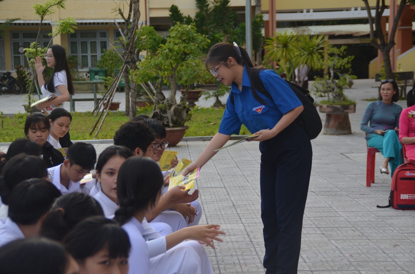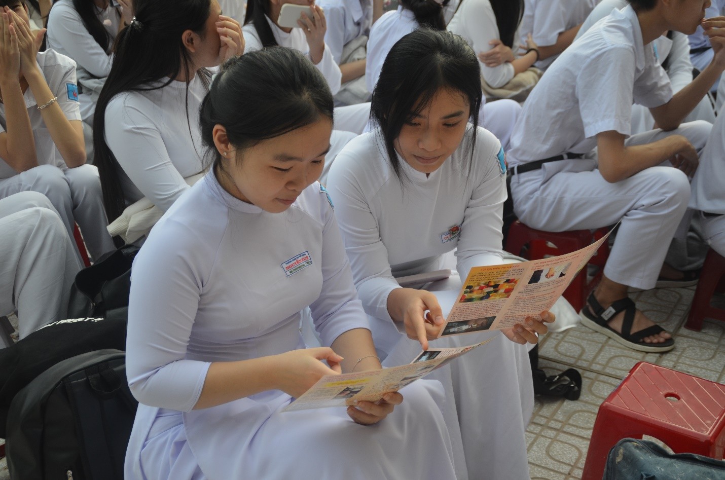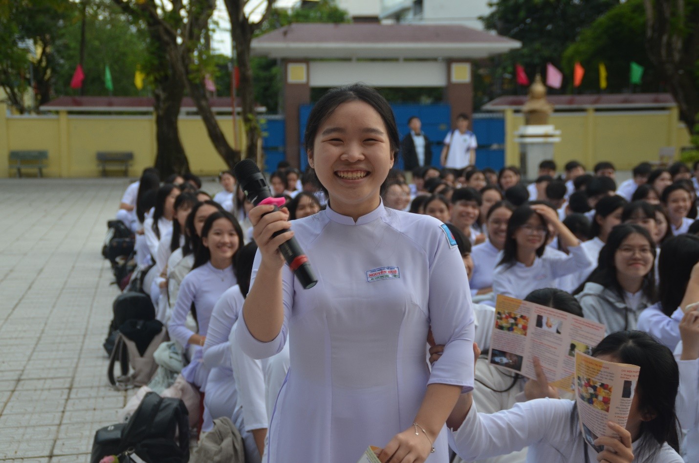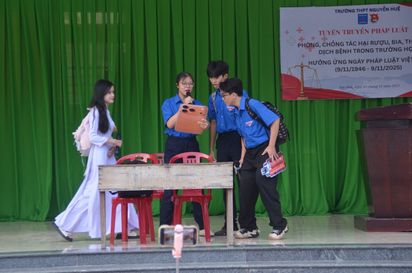 Bên cạnh nội dung tuyên truyền, chương trình còn có các tiểu phẩm tuyên truyền ngắn, tiết mục văn nghệ và phần thi hỏi – đáp nhanh về kiến thức pháp luật, tạo không khí sôi nổi, thu hút sự tham gia tích cực của học sinh toàn trường. Ngoài ra, Đoàn trường và Phòng Y tế cũng phát tờ rơi tuyên truyền, giúp học sinh ghi nhớ thông tin và lan tỏa thông điệp đến bạn bè, gia đình.