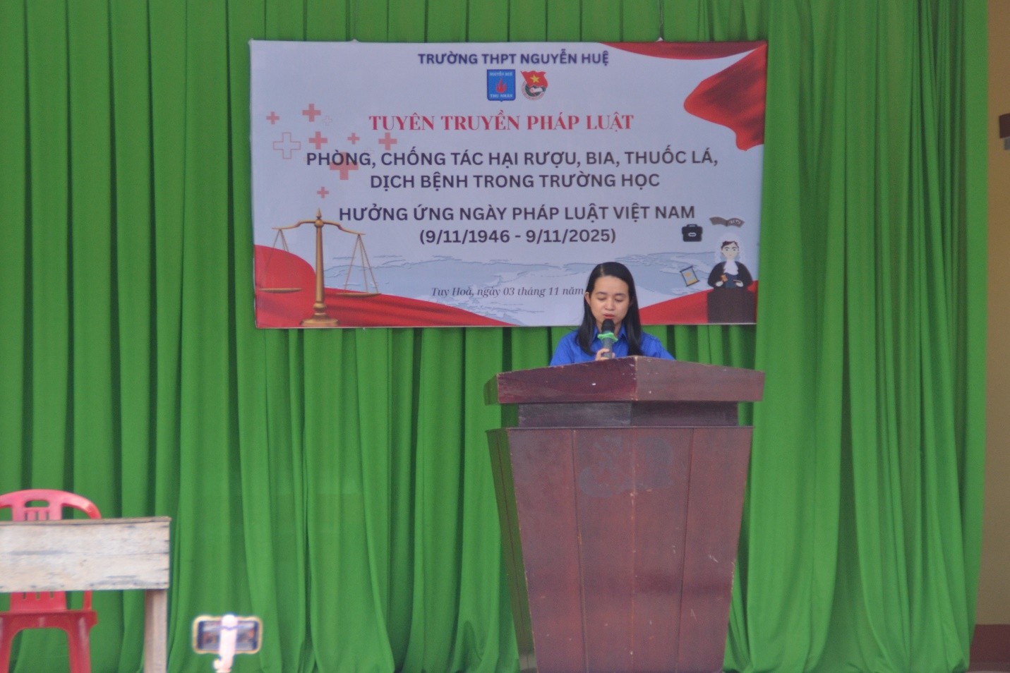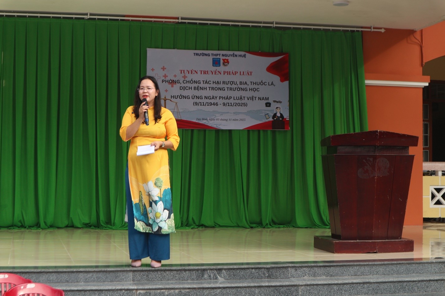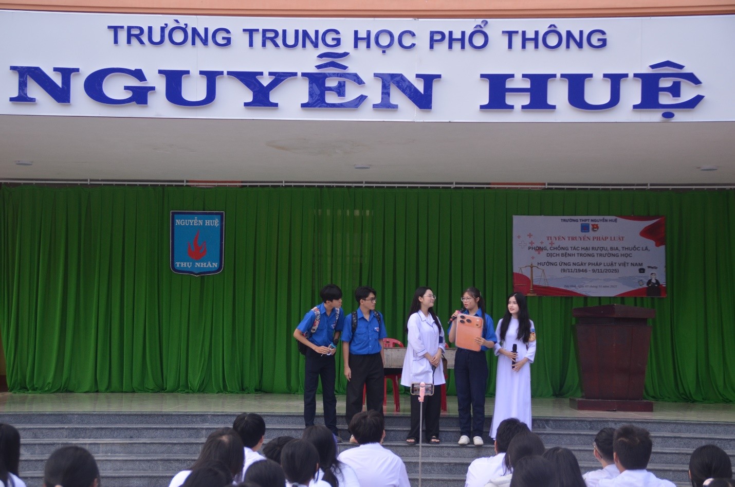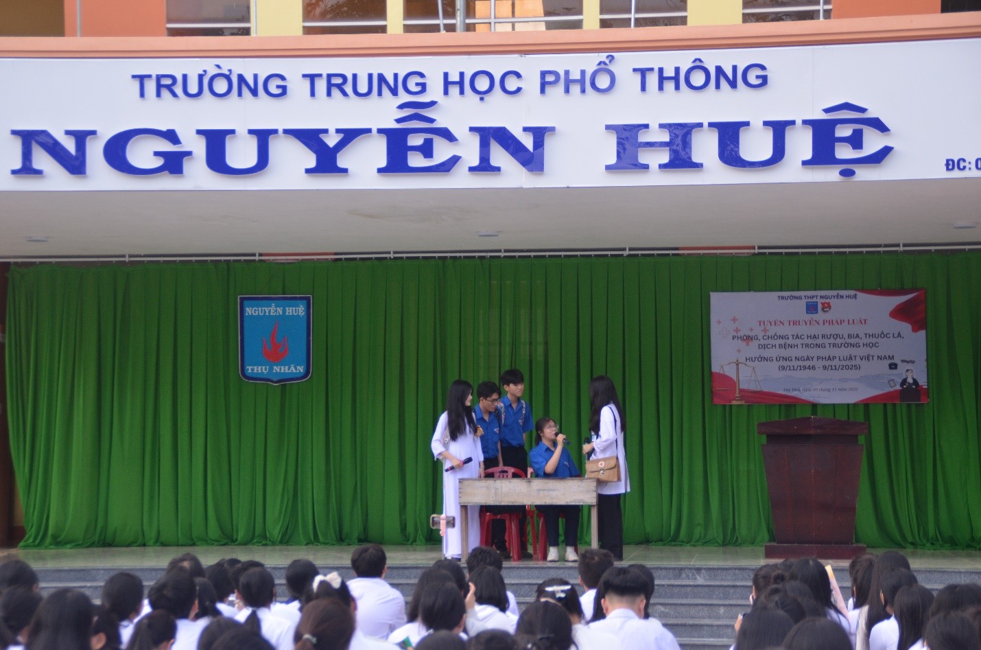 hực hiện kế hoạch của nhà trường về việc tổ chức các hoạt động hưởng ứng Ngày Pháp luật Việt Nam (9/11/1946 – 9/11/2025), sáng thứ Hai, ngày 03 tháng 11 năm 2025, trong tiết chào cờ đầu tuần, Đoàn trường THPT Nguyễn Huệ phối hợp với Phòng Y tế nhà trường tổ chức buổi tuyên truyền pháp luật về phòng, chống tác hại của rượu, bia, thuốc lá và phòng, chống dịch bệnh trong trường học.
