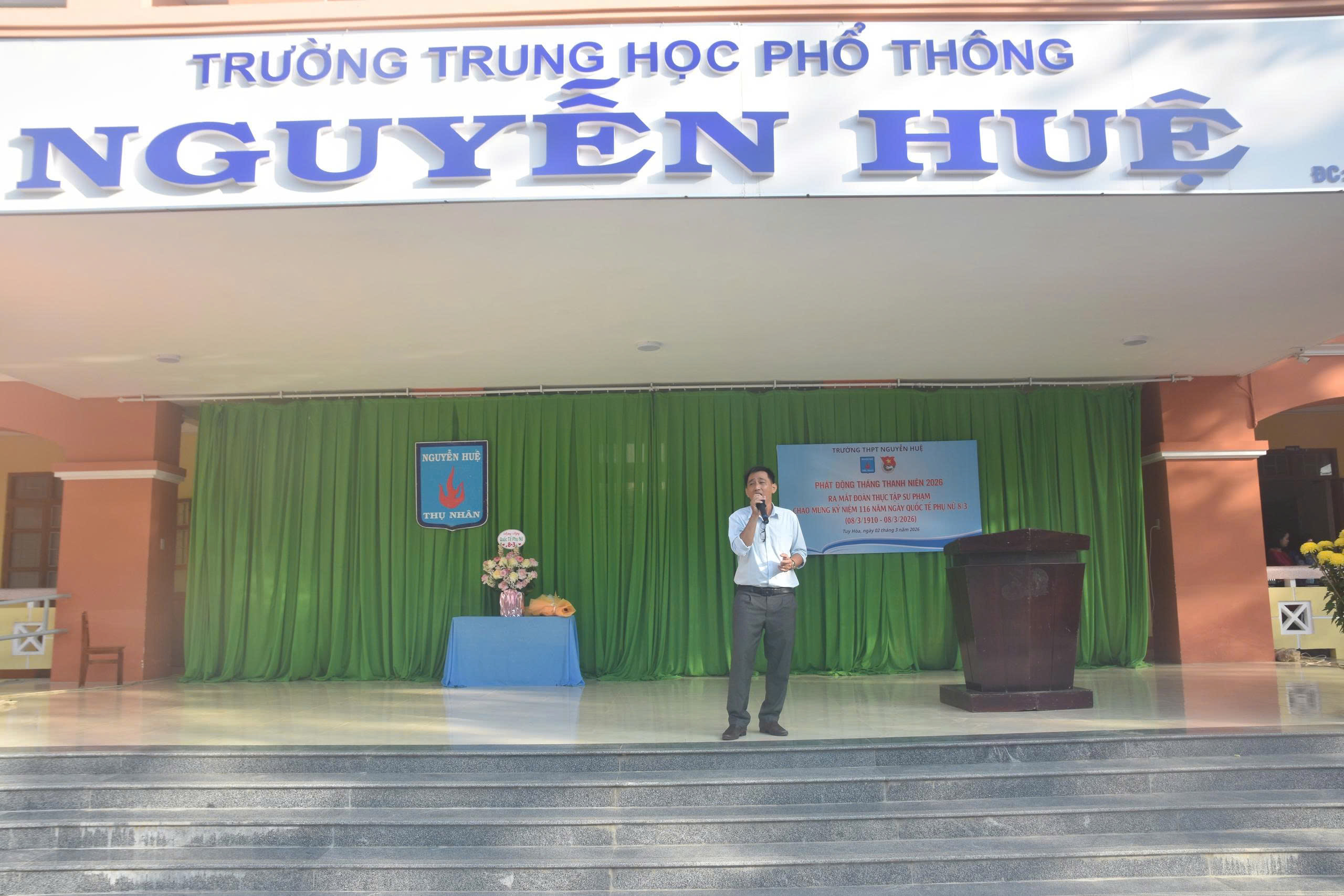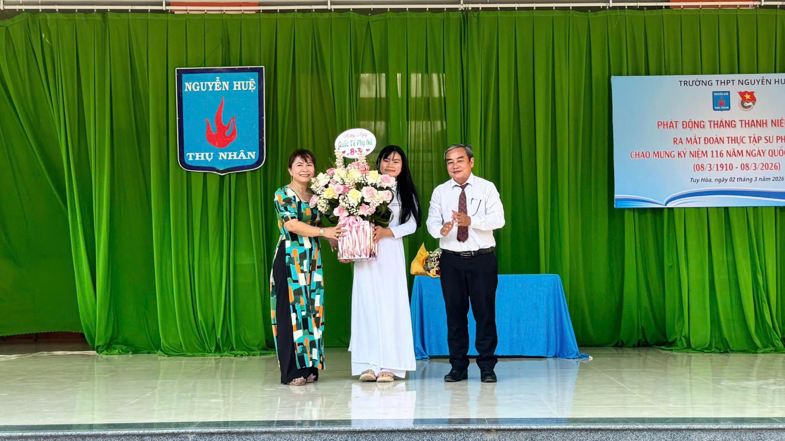Thầy Nguyễn Văn Thuyền – Phó hiệu trưởng nhà trường tặng hoa chúc mừng nhân dịp Ngày Quốc Tế Phụ Nữ 8.3