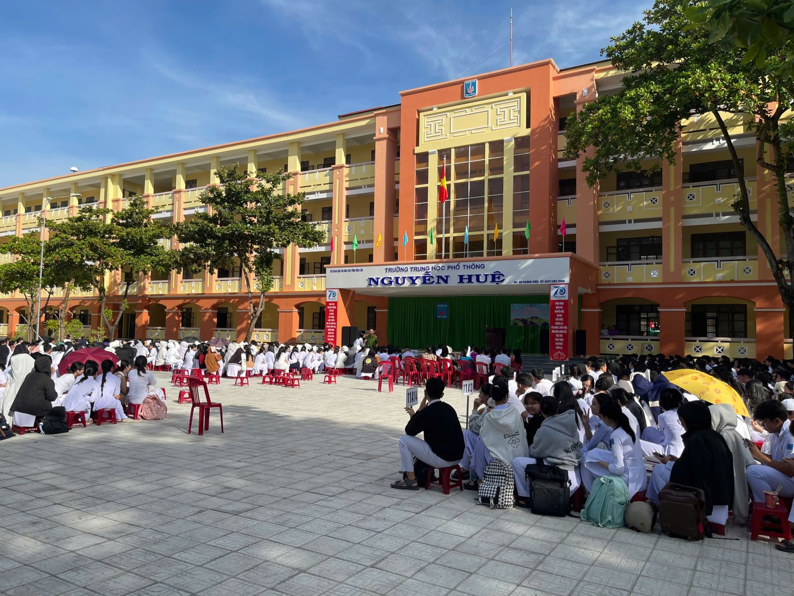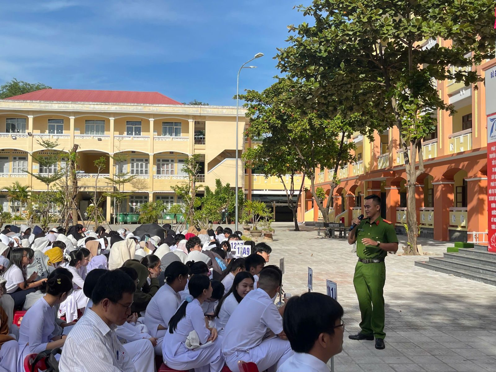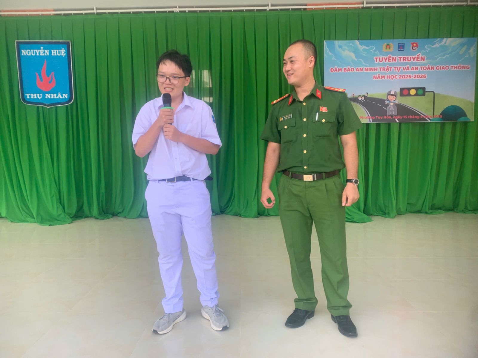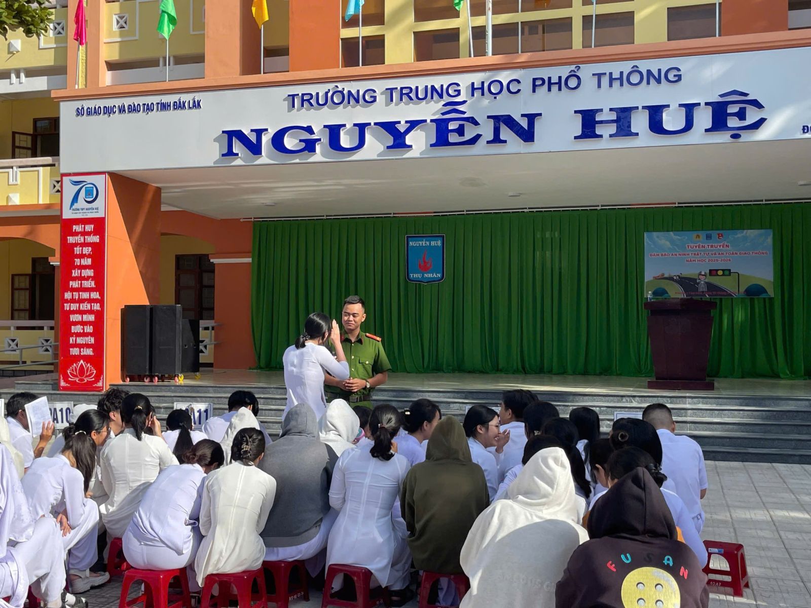 Ngày 15/9/2025, trường THPT Nguyễn Huệ phối hợp với công an phường Tuy Hòa tổ chức tuyên truyền, phổ biến giáo dục pháp luật về đảm bảo an ninh trật tự và an toàn giao thông năm học 2025 – 2026 cho toàn thể giáo viên, học sinh nhà trường.