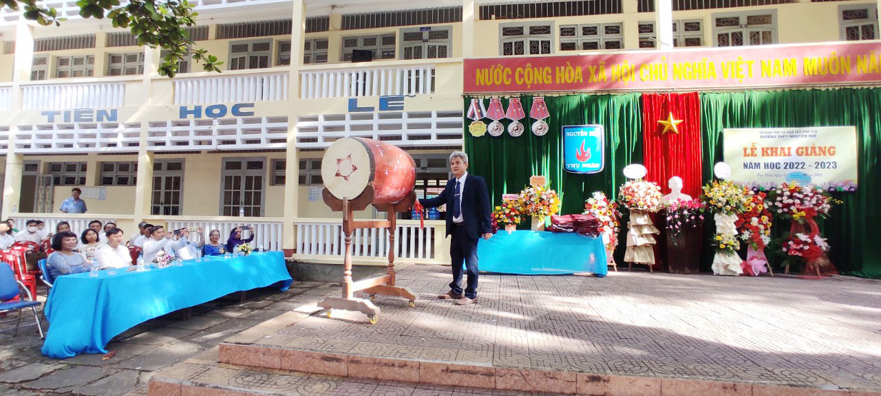 Thầy hiệu trưởng Lê Văn Son đánh trống khai giảng năm học mới 2022-2023