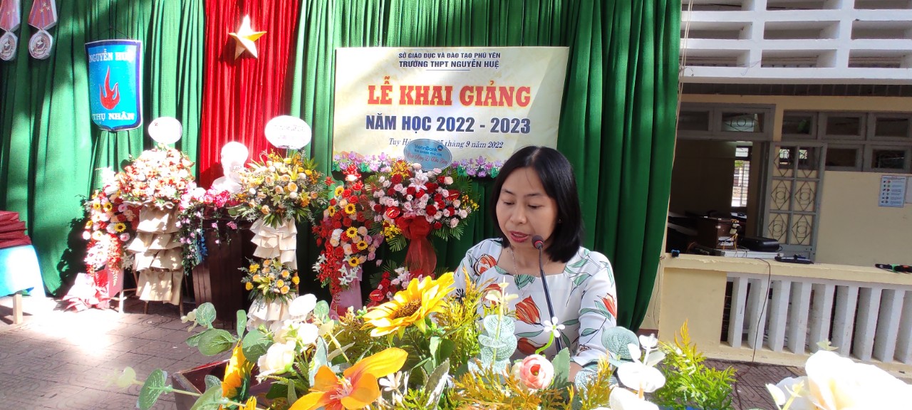 Cô Phạm Thị Tố Xuân- chủ tịch công đoàn trường đọc Thư của Chủ tịch nước và chủ tịch Tỉnh gửi chúc mừng các thầy cô và học sinh nhân ngày khai trường.