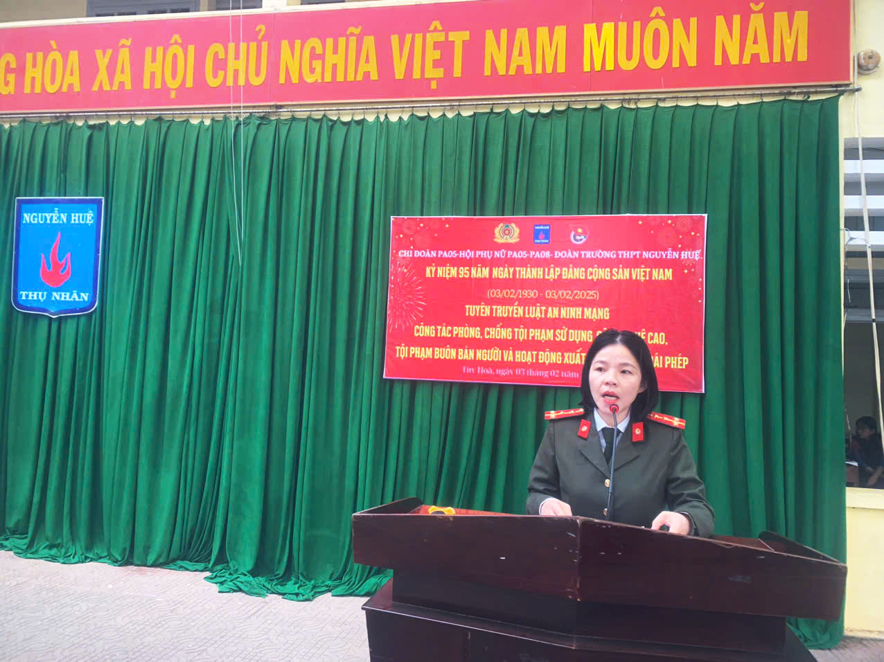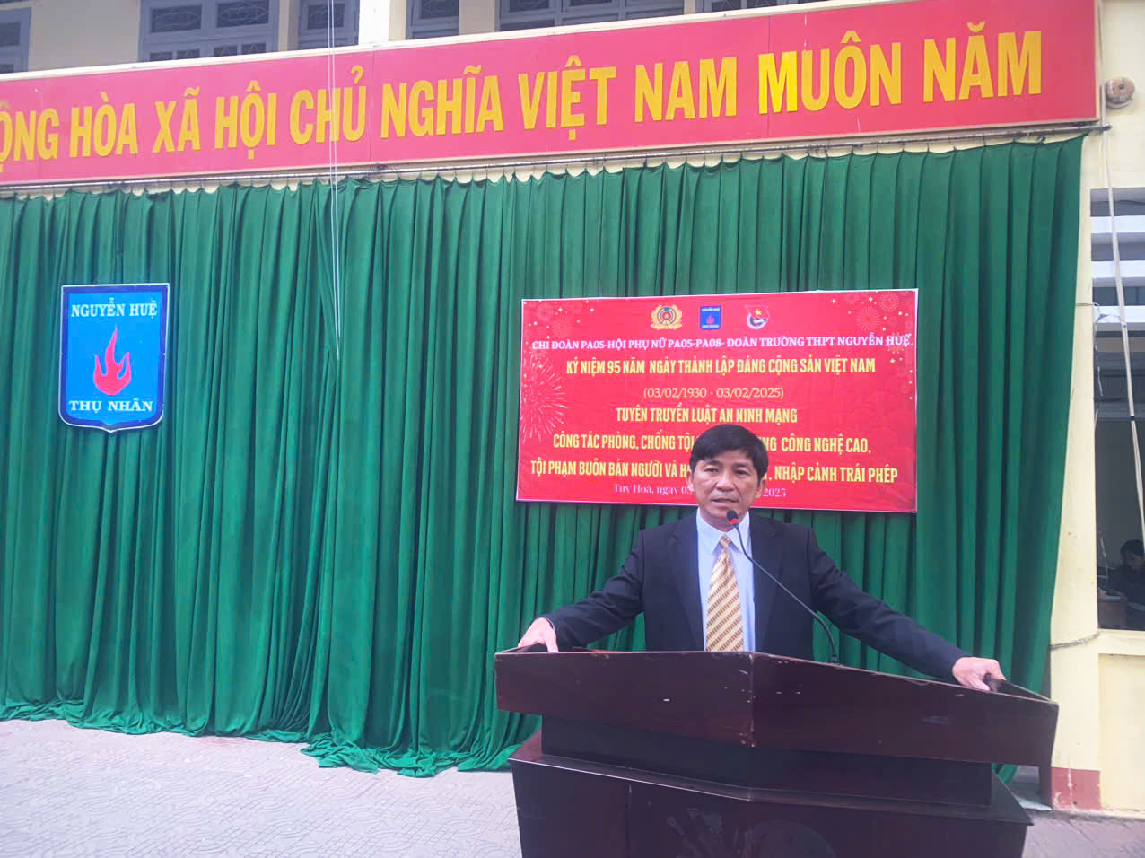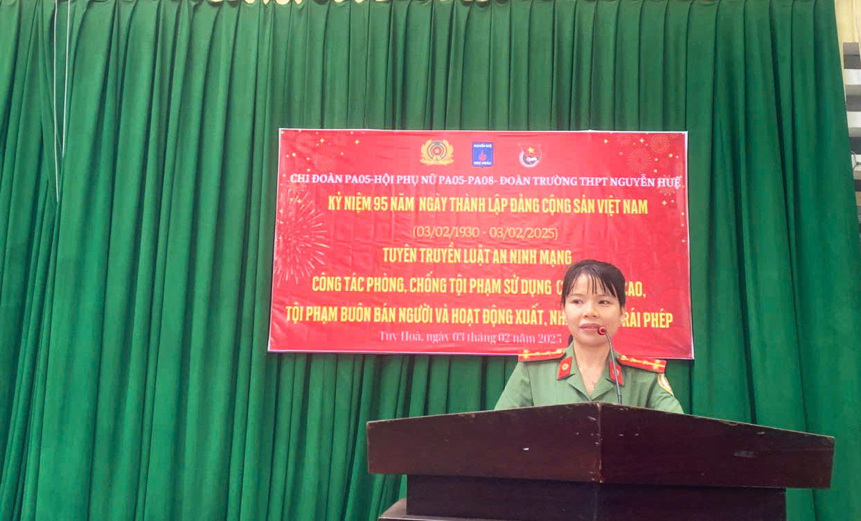Trong không khí đón chào mùa xuân mới, sáng ngày 03/02/2025, được sự cho phép của lãnh đạo nhà trường, Ban chấp hành Đoàn trường THPT Nguyễn Huệ phối hợp với Chi đoàn Phòng PA05, Hội phụ nữ PA05-PA08 Công an tỉnh Phú Yên tổ chức tuyên truyền Luật An ninh mạng, công tác phòng, chống tội phạm sử dụng công nghệ cao, tội phạm buôn bán người, hoạt động xuất, nhập cảnh trái phép và hưởng ứng chào mừng kỷ niệm 95 năm Ngày thành lập Đảng Cộng sản Việt Nam (3/2/1930 – 3/2/2025)