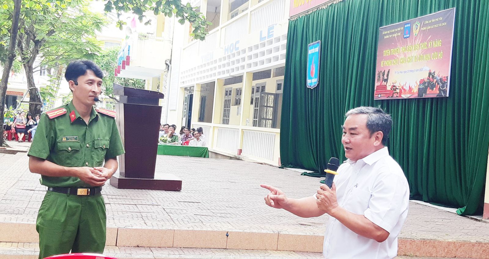 Thầy Nguyễn Văn Thuyền phó hiệu trưởng nhà trường phát biểu giao lưu cùng cán bộ Cảnh sát PCCC tại buổi tuyên truyền